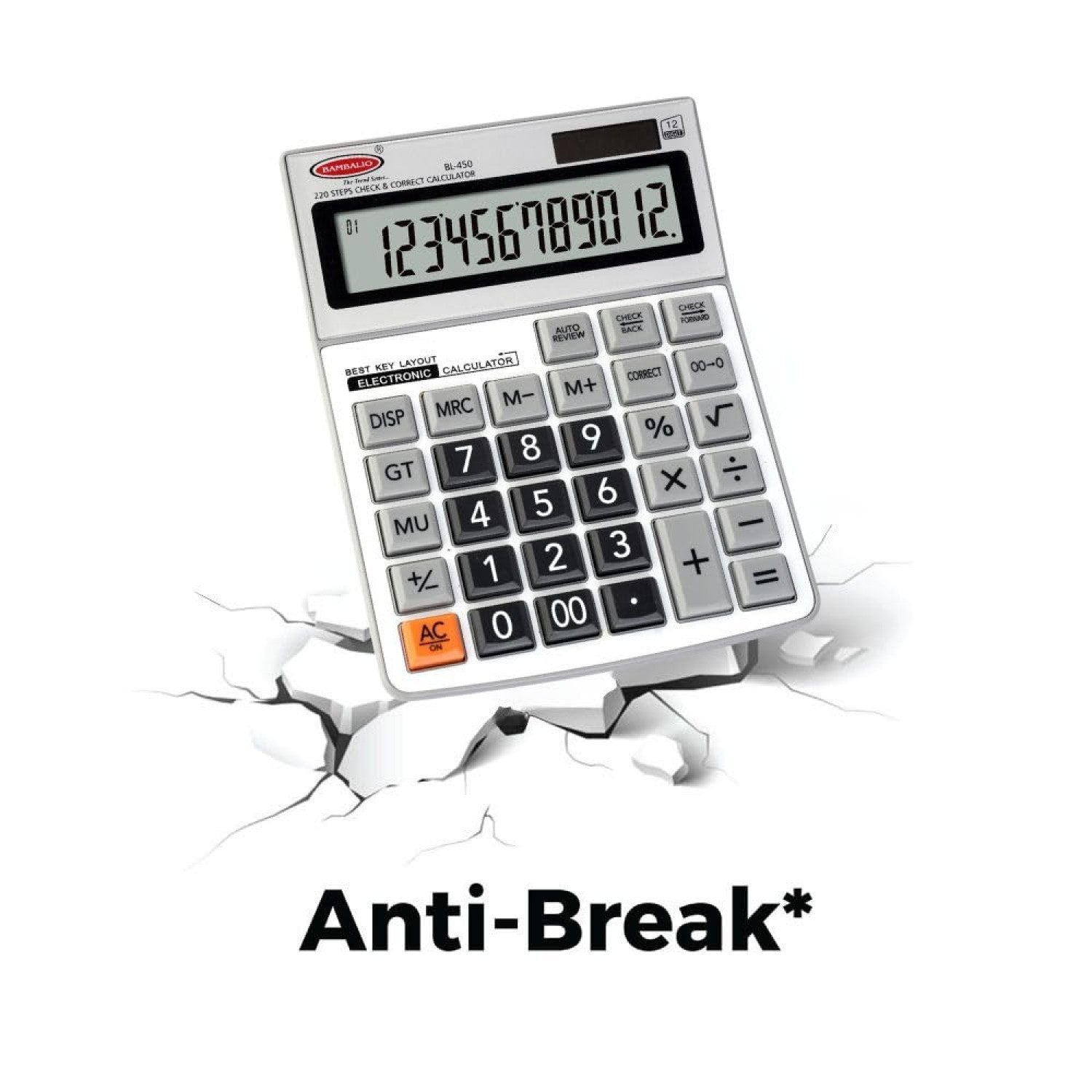 The Bambalio BL-450 is a professional-grade 12-digit desktop calculator engineered for precision and durability. Its innovative 220-step calculation check feature with back and forward navigation lets you review and verify every computation effortlessly. The 30° angled display reduces eye strain during extended use, while dual power design ensures uninterrupted operation. Four anti-slip corner pads provide stability on any surface, and advanced anti-break technology safeguards the unit from accidental drops. Equipped with essential functions including add, subtract, multiply, divide, percentage, memory operations, and grand total, plus automatic power-off after 6 minutes of inactivity. Ideal for business professionals, accountants, students, and home users managing budgets or daily calculations. Backed by a comprehensive 3-year warranty for complete peace of mind.