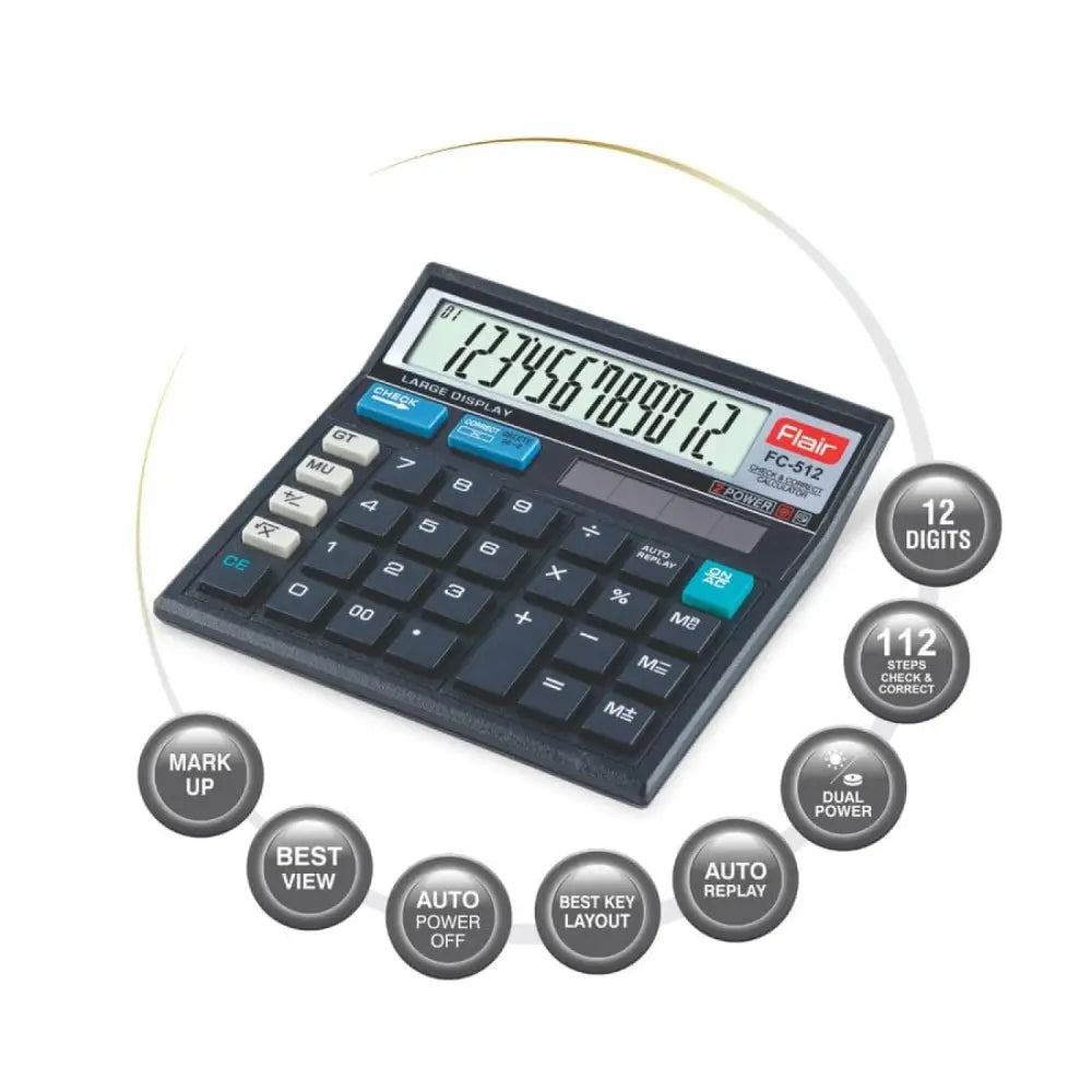 The Flair FC-512 Desktop Series Calculator delivers reliable performance for everyday computational needs. Featuring a clear 12-digit display with optimal key layout, this black calculator measures 130 x 125 mm and fits seamlessly on desks, countertops, or in your bag. Dual power functionality—combining battery and solar energy—ensures uninterrupted operation whether you're at home or in the office. The auto power-off feature conserves energy, while the markup function and auto-replay capability streamline repetitive calculations. Built for professionals, students, and office workers, this portable calculator combines durability with practical functionality for accurate, efficient computation.