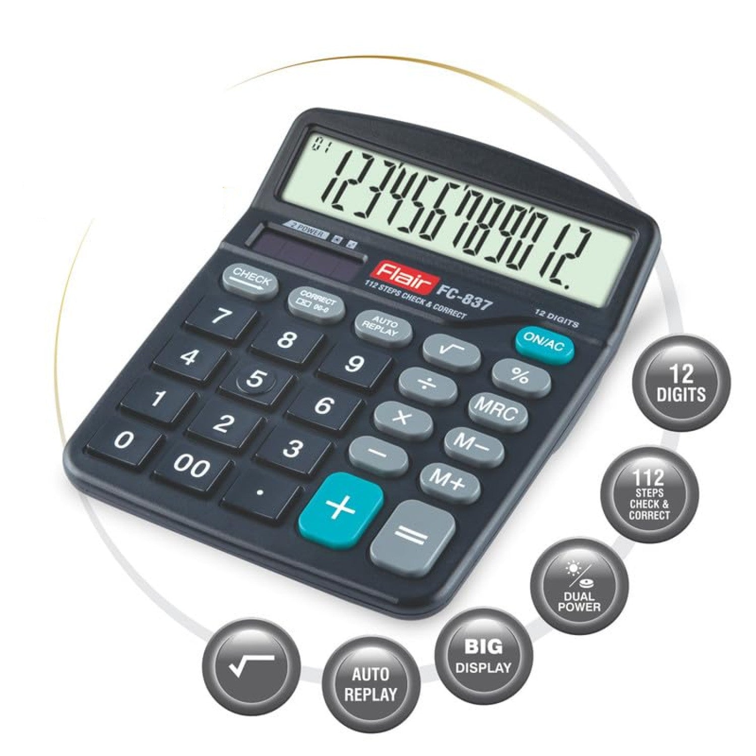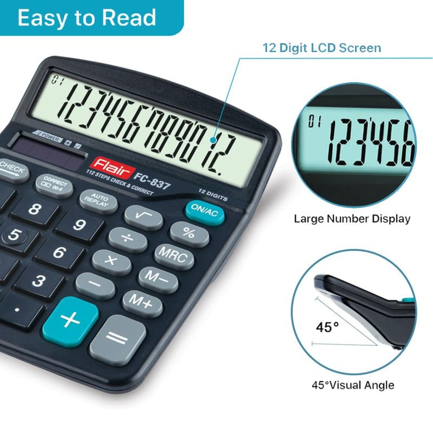 The Flair FC-837 Desktop Series Calculator combines functionality with reliability for professional and academic use. This 12-digit calculator features dual power sources—solar and battery—ensuring uninterrupted operation in any environment. The large, easy-to-read display reduces calculation errors, while the 112-step check and correct function allows you to review and modify previous entries. Additional features include square root calculation capability, making it suitable for scientific and mathematical applications. Its compact 120 x 150 mm design fits seamlessly on desks or in bags, offering portability without compromising usability. Ideal for students, accountants, engineers, and office professionals who demand precision and dependability in their daily calculations.