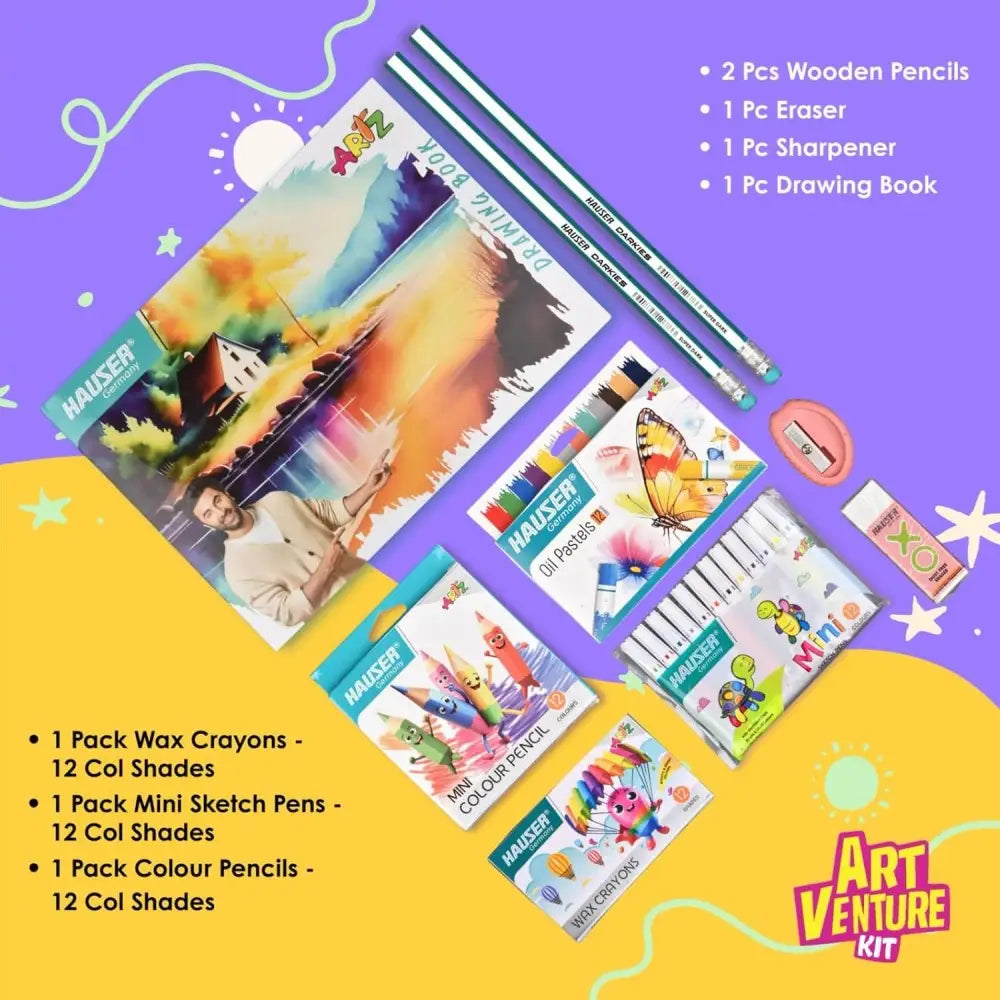 The Hauser Artz Art Venture Kit offers a complete set of 9 essential art tools designed for young artists. It includes a premium 21 x 29.7 cm drawing book ideal for sketching and colouring, along with 12 shades each of wax crayons, mini sketch pens, mini colour pencils, and oil pastels for a wide range of creative expression. Equipped with 2 wooden pencils, an eraser, and a sharpener, this portable kit ensures artists can maintain and refine their work wherever they go. Perfect for art classes, travel, or home use.