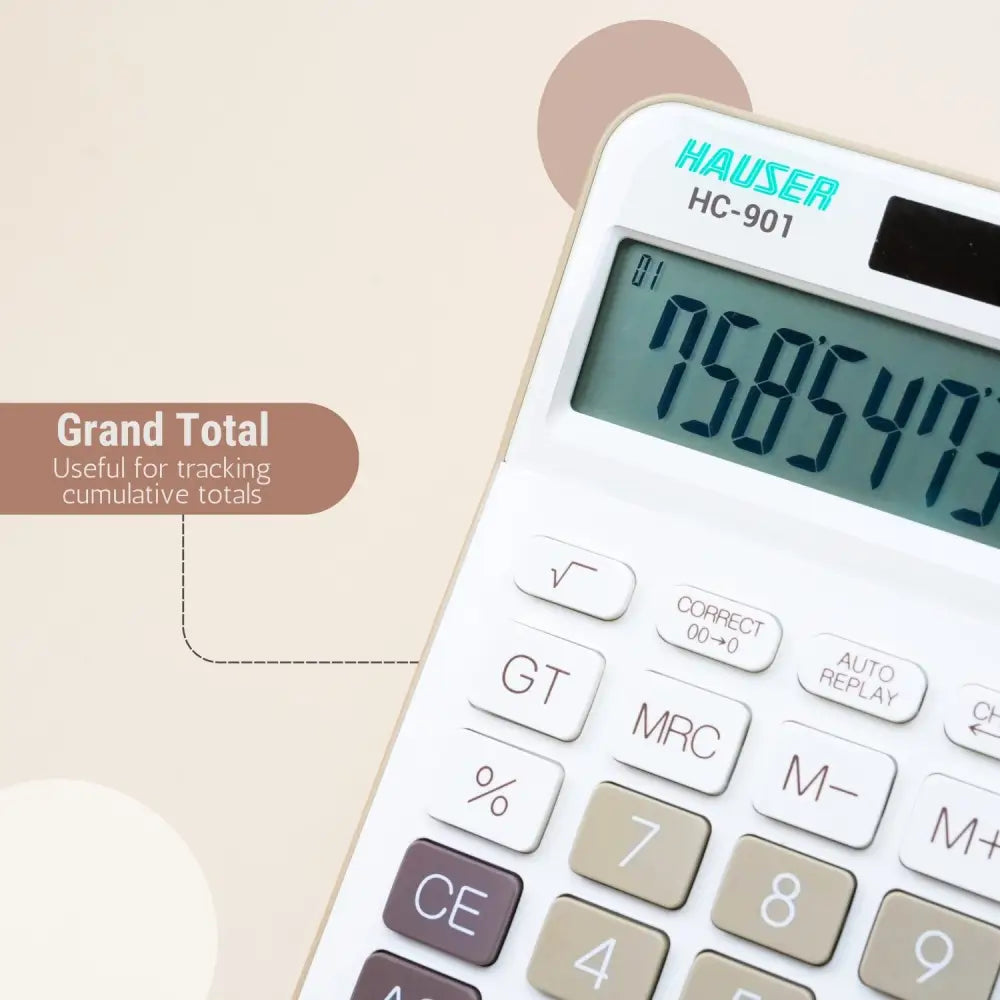 The Hauser HC-901 brings professional-grade calculation to your desk with its expansive 12-digit display for handling substantial figures with precision. The 112-step check and correct function allows you to review and modify calculations without starting over, streamlining your workflow. Auto replay capability lets you revisit previous entries effortlessly. Engineered with dual power technology—both battery and solar options—this calculator adapts to any environment and reduces dependency on single power sources. The grand total feature consolidates multiple calculations instantly. Built to last, it comes backed by a comprehensive 1-year warranty, making it an investment in reliable desktop computing for accounting, finance, and administrative tasks.