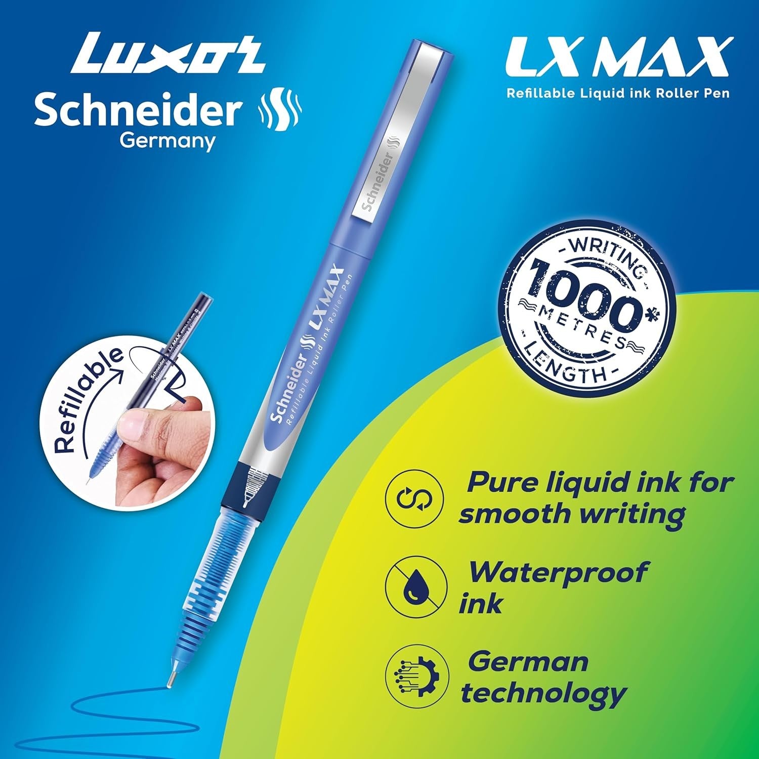 Luxor Schneider LX-MAX Roller Ball Pen | Pack of 3 | Ink Colour - Blue, Black and Green