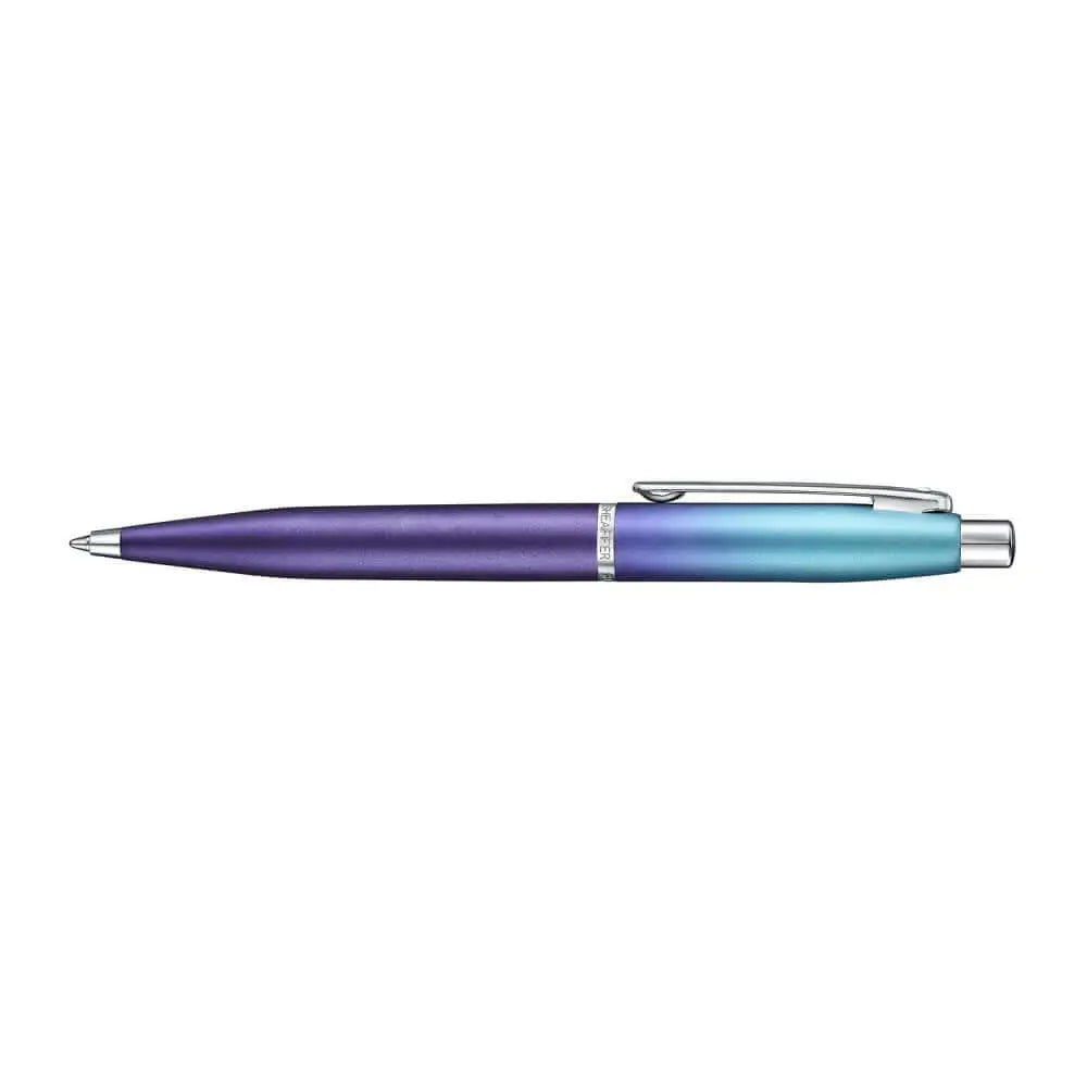 This elegant gift set features the Sheaffer Expressions VFM 9430 ballpoint pen with a pearlised blue and purple gradient finish and chrome-plated trims, offering smooth writing via a convenient push-button mechanism. Complementing it is a genuine metallic-finish leather card case with RFID protection, designed to securely hold up to four cards and a zippered compartment for coins or small essentials. Packaged in a premium, plastic-free, and responsibly recyclable all-paper gift box, this set combines sophistication with practical security and eco-conscious presentation.